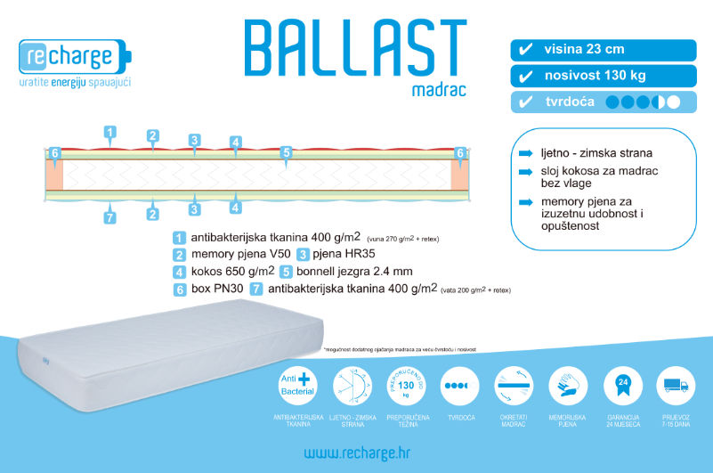 Madrac BALLAST u svojoj osnovi ima bonnell jezgu 2.4 mm koja je bočno dodatno ojačana sa PN30 pjenom (gustoće 30 kg/m3) za veću čvrstoću i nosivost. Za još veću kvalitetu madrac BALLAST ima i sloj kokosa sa obje strane madraca. Kokos je potpuno prirodni materijal u kojem se vlaga ne zadržava, već samo prolazi kroz kokosova vlakna i lako ispari iz madraca. Stoga madraci sa kokosovim vlaknima gotovo i nemaju mogućnost za pojavu plijesni, a kokos ujedno i odbija razne nametnike. Vanjska navlaka na madracu izrađena je od antibakterijski tretirane tkanine sa slojem vate na ljetnoj strani madraca što osigurava svježinu i osjećaj hlađenja tijekom ljetnih noći, dok sloj ovčje vune na zimskoj strani madraca daje osjećaj topline i ugode. Sloj HR35 pjene (gustoće 35 kg/m3) izvrsno podupire tijelo zahvaljujući visokoj elastičnosti. HR35 pjena jedan je od najboljih materijala koji se koriste u izradi madraca te ima povećanu trajnost. Za najveću udobnost uz sloj HR35 pjene madrac BALLAST ima i sloj memory pjene koja izvrsno podupire cijelo tijelo a da pritom ne stvara veliki pritisak. Memory pjena prilagođava se tijelu i osigurava izuzetnu udobnost i opuštenost. Spavajući na madracu BALLAST puno manje ćete se okretati tijekom noći jer će vam sloj memory pjene osigurati miran san. Kada se probudite osjećati ćete se odmorno i puni energije, spremni za uspješno obavljanje svih svojih obaveza.