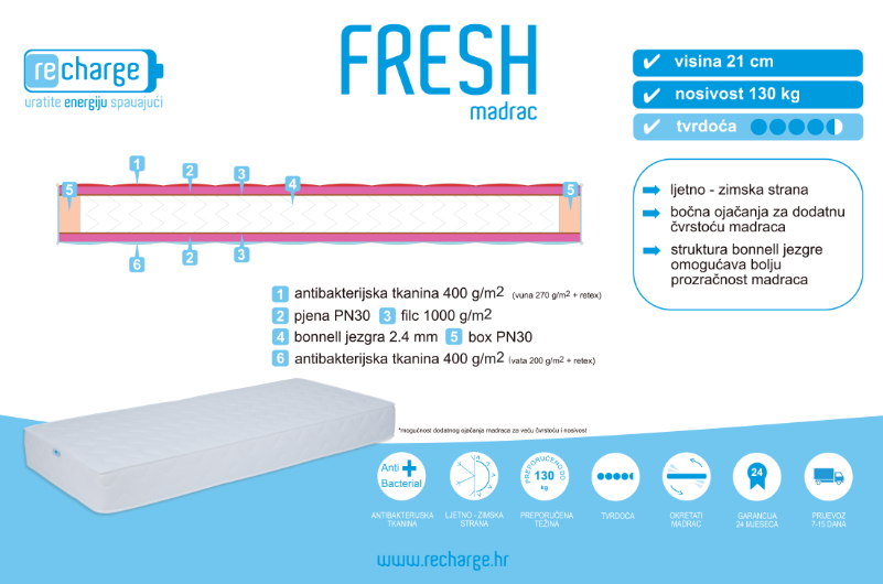 Madrac FRESH u svojoj osnovi ima bonnell jezgru 2.4 mm na kojoj su obostrano postavljene plohe posebno obrađenog filca izuzetno velike tvrdoće koji prvenstveno madracu daje čvrstoću i dugotrajnost. Bonnell jezgra se prilagođava stupnju opterećenja, a ujedno omogućuje nesmetano strujanje zraka kroz samu unutrašnjost madraca prilikom korištenja. Udobnost madraca FRESH jamči sloj visokokvalitetne pjene, dok bočna ojačanja od PN30 pjene (gustoće 30 kg/m3) garantiraju dodatnu čvrstoću madraca. Vanjska navlaka na madracu izrađena je od antibakterijski tretirane tkanine sa slojem vate na ljetnoj strani madraca što osigurava svježinu i osjećaj hlađenja tijekom ljetnih noći, dok sloj ovčje vune na zimskoj strani madraca daje osjećaj topline i ugode. Madrac FRESH Vam omogućava udobnost kod spavanja, a kad se probudite biti ćete svježi i puni energije, spremni za uspješno obavljanje svih svojih obaveza.