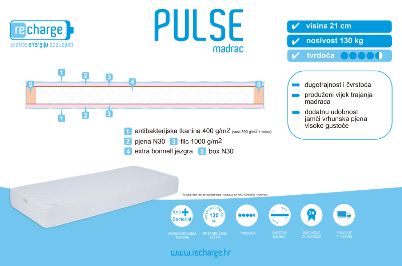 Madrac PULSE u svojoj osnovi ima extra bonnell jezgru što znači da svaka opruga ima više namotaja od klasične bonnell opruge. Rezultat opruga sa više namotaja je povećana elastičnost bonnel jezgre. Obostrano postavljeni slojevi filca u madracu PULSE osiguravaju čvrstoću i dugotrajnost jezgre. Za dodatnu čvrstoću i dugotrajnost madrac je bočno ojačan sa visokokvalitetnom N30 pjenom (gustoće 30 kg/m3). Vanjska navlaka na madracu izrađena je od antibakterijski tretirane tkanine sa slojem vate na obje strane. Madrac PULSE je upravo zbog strukture jezge prozračan, tako da se sva vlaga koja se skuplja tijekom spavanja lako odstranjuje iz madraca. Dodatnu udobnost jamči sloj N30 pjene koja je elastična i doprinosi dodatnoj udobnosti madraca.