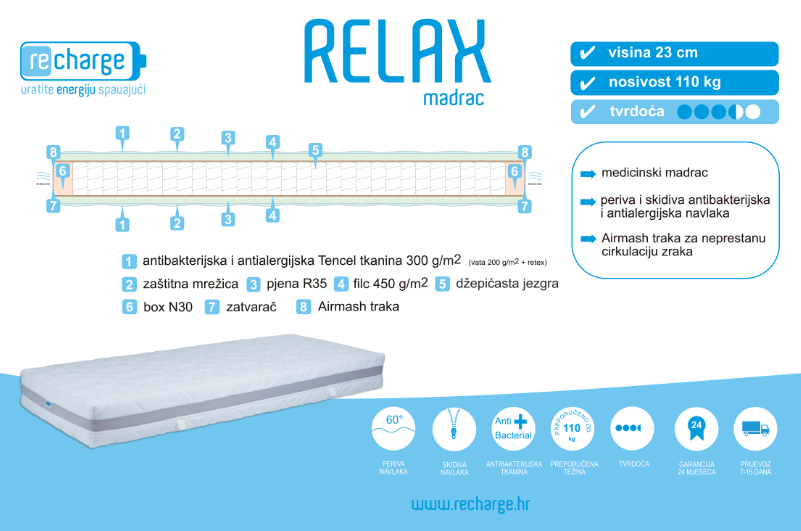 Vanjska navlaka na madracu RELAX izrađena je od od antibakterijske i antialergijske Tencel tkanine koja je skidiva i periva na 60°C, temperaturi koja uništava bakterije i grinje. Zahvaljujući Airmash mrežastoj traci osigurana je neprestana cirkulacija zraka. Filc u madracu RELAX omogućava elastičnost ali istovremeno i čvrstoću i dugotrajnost jezgre zbog svoje otpornosti na temperaturne i klimatske promjene. Džepićaste opruge u madracu RELAX dodatno su bočno ojačane, dok sloj R35 pjene (gustoće 35 kg/m3) osigurava visoki nivo udobnosti. Madrac RELAX zbog svoje džepićaste jezge spada u skupinu medicinskih madraca budući da anatomski podupire tijelo. Spavajući na madracu RELAX manje ćete se okretati tijekom noći, a kada se probudite osjećat ćete se odmorno i „napunjenih baterija“, spremni za dnevne obaveze.