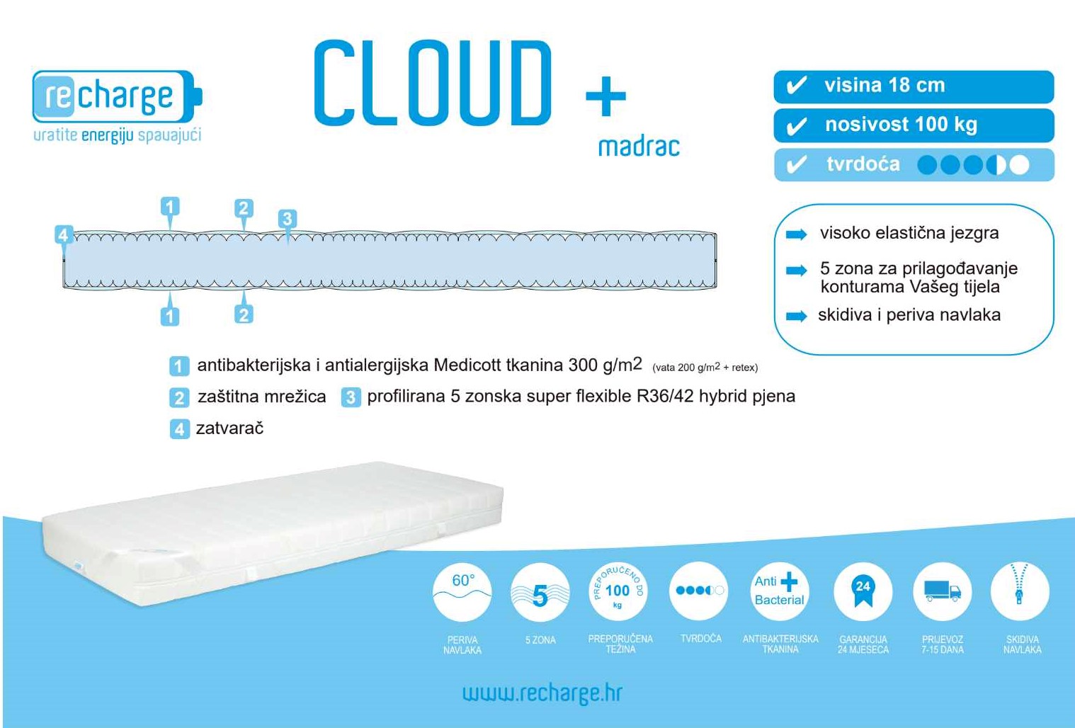 CLOUD + je madrac sa 5 zona koji zbog posebnog načina profiliranja omogućuje dobru cirkulaciju, ravnomjerno raspoređuje tjelesnu težinu i umanjuje pritisak na kralježnicu. Za dodatnu udobnost madrac CLOUD + ima i sloj vate na obje strane madraca koja omogućava svježinu i osjećaj hlađenja. Sama navlaka na madracu CLOUD + izrađena je od antialergijske i antibakterijske Medicott Silver Guard tkanine koja je periva u perilici rublja na 60°C.