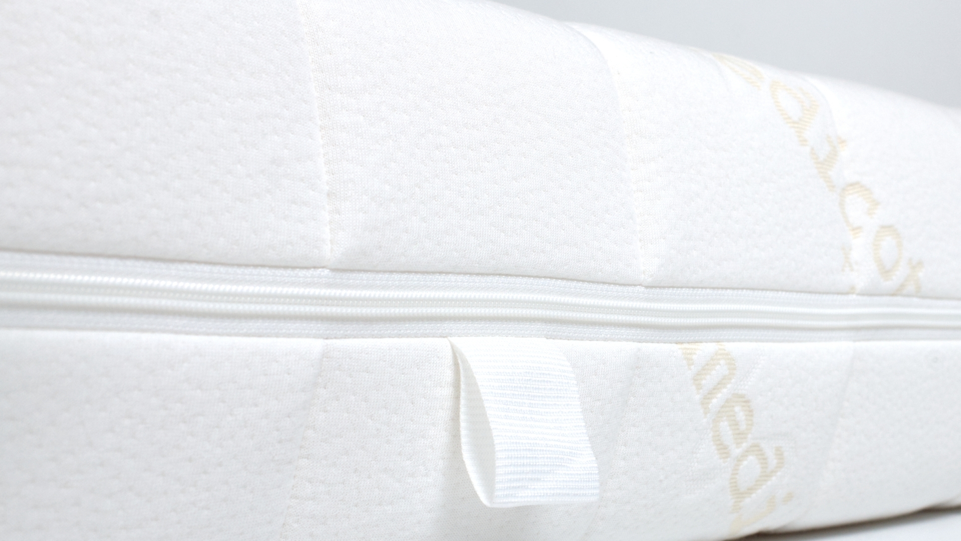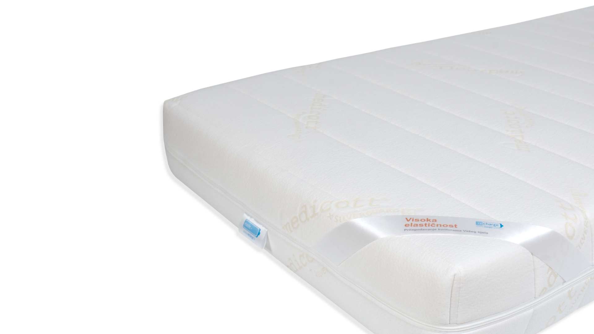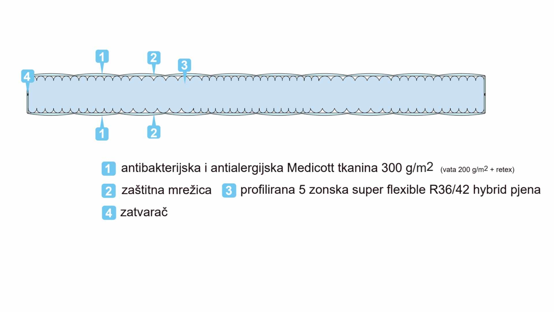 Slojevi: antibakterijska i antialergijska Medicott tkanina 300 g/m2 (vata 200 g/m2 + retex), zaštitna mrežica, profilirana 5 zonska super flexible R36/42 hybrid pjena, zatvarač