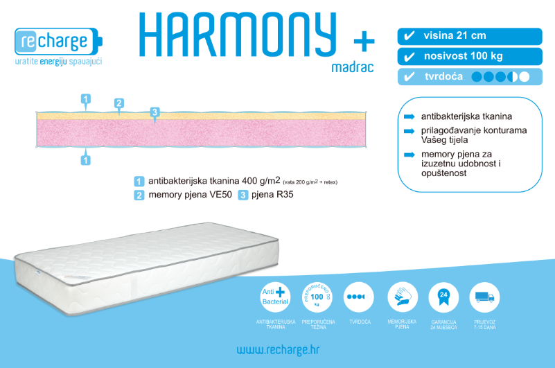 Madrac HARMONY + u svojoj osnovi ima visokokvalitetnu R35 pjenu. R35 pjena (gustoće 35 kg/m3) otporna je na deformacije i velike je izdržljivosti. Za najveći komfor i udobnost tijekom spavanja madrac HARMONY + ima i sloj memory pjene visine 4 cm. Memory pjena se prilagođava individualnoj konturi tijela te osigurava izuzetnu udobnost i opuštenost. Visokokvalitetna R35 pjena u kombinaciji sa memory pjenom drži vaše tijelo u pravilnom položaju, oslobađa ga od pritiska i poboljšava cirkulaciju. Madrac HARMONY + presvučen je antibakterijskom tkaninom sa slojem vate za dodatnu mekoću i udobnost.